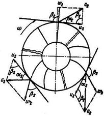 ω - относительная скорость, вектор скорости направлен по касательной к профилю лопатки;
