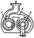 Центробежно-вихревой насос типа ЭСН (рис.38) имеет колесо 1, которое каналом 2 соединено с улиткой корпуса центробежного насоса 3. При вращении колеса вихревого насоса создается разрежение, чем обеспечивается отсос воздуха из полости всасывающего трубопровода центробежного насоса и его работа без предварительной заливки приемного трубопровода.