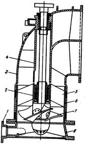 Конструкция осевого насоса показана на рис.40. Приемная нижняя часть корпуса 8 имеет аварийный патрубок 1. В корпусе 3 установлены рабочее колесо (пропеллер) 7, представляющее собой трубу, защитное кольцо 6 и направляющие лопасти 5. Вал консольного типа, заключенный в обтекатель 4, вращается в подшипниках 2, имеющих резиновые вкладыши и водяную смазку. Криволинейное направляющее ребро в напорной части способствует повышению кпд насоса.