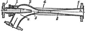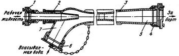 Водоструйный эжектор (рис.41) используют для осушения судовых отсеков. Рабочей жидкостью служит забортная вода, подаваемая пожарным насосом через сужающееся сопло 2 в камеру смешения, в которой из-за большой скорости выхода рабочей жидкости из сопла создается разрежение и откачиваемая жидкость поднимается по всасывающему патрубку 7. Смесь рабочей жидкости с откачиваемой попадает в расширяющееся сопло 3 и далее в нагнетательный патрубок 5. В расширяющемся сопле (диффузоре) давление смеси увеличивается до значения, необходимого для преодоления гидравлических сопротивлений в нагнетательном трубопроводе и для удаления смеси за борт или в сборную цистерну.