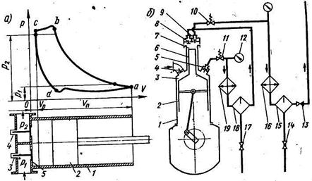 Рис.42. Схемы поршневых компрессоров: а - одноступенчатого; б - двухступенчатого
