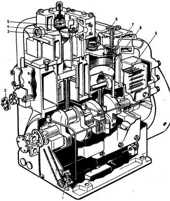 Рис.7.1. Двухступенчатый воздушный компрессор: 1 - масляный насос; 2 - ручной клапан продувания; 3 - поршень второй ступени; 4 - всасывающий клапан второй ступени; 5 - нагнетательный клапан второй ступени; 6 - всасывающий клапан первой ступени; 7 - нагнетательный клапан первой ступени; 8 - поршень первой ступени; 9 - трубки охладителя первой ступени.