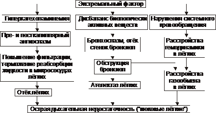 ‡ Нарушениями микрогемоциркуляции в лёгких, отёком их, обструкцией бронхиол и очаговыми ателектазами, что обусловливает острую дыхательную недостаточность. Описанные изменения известны как «синдром шоковых лёгких» (рис. 20–10).