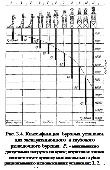 Каждая категория буровой установки имеет несколько классов, которые обеспечивают наибольшую эффективность бурения скважин определенной глубины и конструкции. Поскольку каждой буровой установкой при определенной мощности ее двигателей, максимально допустимой нагрузке на крюке можно пробурить скважины различной глубины и конструкции, то для сравнительной оценки мощности и класса буровой установки буровой установки для глубокого бурения принимают допустимую нагрузку на крюке и номинальную глубину скважины конечного диаметра 215 мм, которые могут быть достигнуты при использовании бурильной колонны с бурильными трубами диаметром 114 мм и массой 1 м труб 30 кг.