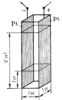 Эквивалентной электропроводностью называется электрическая проводимость раствора электролита толщиной 1 м, находящегося между одинаковыми электродами с такой площадью, чтобы объем жидкости, заключенный между ними, содержал 1 моль химического эквивалента растворенного вещества.