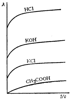 Рис. 84. Зависимость эквивалентной электропроводности растворов электролитов от степени разбавления