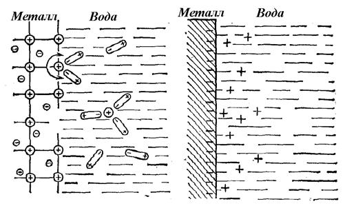 При опускании металлической пластинки в воду на её поверхности возникает отрицательный электрический заряд. Механизм его появления состоит в следующем. В узлах кристаллической решетки металлов находятся положительно заряженные ионы или нейтральные атомы, между которыми двигаются свободные электроны.
