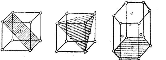 Плоскость скольжения – кристаллографическая плоскость наиболее плотноупакованная атомами (Рисунок 10). У металлов, имеющих элементарную ячейку объёмно-центрированного куба, плоскостями скольжения являются так называемые плоскости ромбического додекаэдра. У алюминия,, меди, никеля и др. металлов, имеющих элементарную ячейку гранецентрированного куба, наиболее густо усеяны атомами плоскости октаэдра. У металлов, кристаллизующихся в гексагональную решетку, плоскостями скольжения служат плоскости базиса.