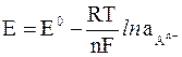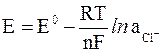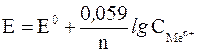 где Е – электродный потенциал, В; Е0 – стандартный электродный потенциал, т.е. потенциал, который возникает на электроде при активности ионов металла соли в растворе, равной 1 моль/дм3 и температуре 298 K (25оС); R – универсальная газовая постоянная, 8,314 Дж/(моль ∙ K); Т – температура, K; n - величина заряда иона металла; F – постоянная Фарадея, равная 96500 Кл/моль;
