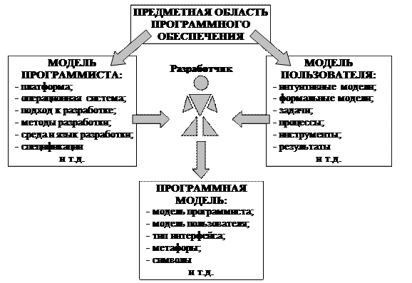 В итоге взаимодействие пользователя с интерфейсом определяется не только его физическими возможностями и особенностямипо восприятию информации, но и пользовательской моделью интерфейса. Существуют три модели пользовательского интерфейса: модель программиста, модель пользователя, программная модель. Программист при разработке интерфейса исходит из того, управление какими операциями нужно реализовать в нем, и как это осуществить, не затрачивая существенных ресурсов компьютера, своих сил и времени. Его интересуют эффективность, функциональность, технологичность, внутренняя стройность и другие не связанные с удобством пользователя характеристики ПО. Именно поэтому большинство интерфейсов существующих программ вызывают серьезные нарекания пользователей. С точки зрения здравого смысла хорошим считается интерфейс, при работе с которым пользователь получает именно то, что он ожидал. Представление пользователя о функциях интерфейса можно описать в виде пользовательской модели интерфейса - совокупности обобщенных представлений конкретного пользователя или группы пользователей о процессах, происходящих во время работы программной системы. Модель базируется на особенностяхопыта конкретных пользователей, который характеризуется уровнем подготовки в предметной области разрабатываемого ПО, интуитивными моделями выполнения операций в этой области, уровнем подготовки в области владения компьютером, а также устоявшимися стереотипами работы с компьютером. Для ее построения необходимо изучить особенности опыта предполагаемых пользователей, для чего используют опросы, тесты и фиксируют на пленку последовательность выполнения операций в реальном процессе. Приведение в соответствие моделей пользователя и программиста, а также построение на их базе программной модели интерфейса (рисунок 14.1) задача не простая. Чем сложнее автоматизируемая предметная область, тем сложнее строить программную модель интерфейса, учитывающую особенности модели программиста и пользовательской модели. С этой точки зрения наиболее перспективны объектные интерфейсы, так как в их основе лежит отображение объектов предметной области, которыми оперируют пользователи. Основой для разработки интерфейса должны стать интуитивные модели выполнения операций в предметной области. Нежелание или невозможность следования интуитивным моделям приводит к созданию искусственных надуманных интерфейсов, которые негативно воспринимаются пользователями.