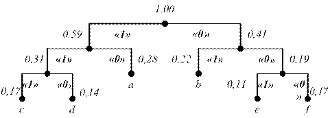 Рассчитаем частоты появления символов: υ (а)=10/36=0,28; υ (b)=8/36=0,22; υ (c)=6/36=0,17; υ (d)=5/36=0,14; υ (e)=4/36=0,11; υ (f)=0,08.