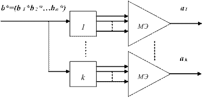 На рисунке: 1…k – устройства, реализующие проверки для соответствующей системы; МЭ – мажоритарный элемент, принимающий решение о значении символа по большинству результатов проверок.