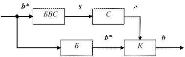 На рисунке: Б – буфер хранения принятого слова; БВС – блок вычисления синдрома; С – селектор (дешифратор) синдрома; К – корректор.