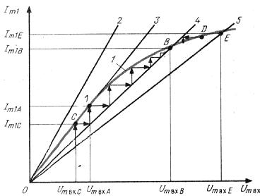 , которому соответствует линия обратной связи 4. Эта линия в условиях мягкого режима самовозбуждения имеет с колебательной характеристикой две общие точки, 0 и В. Точка В соответствует стационарному состоянию автогенератора, характеризующемуся амплитудами тока Im1B и напряжения UmвхВ. В это состояние генератор приходит в процессе самовозбуждения, но может выйти из него под действием различных дестабилизирующих факторов.