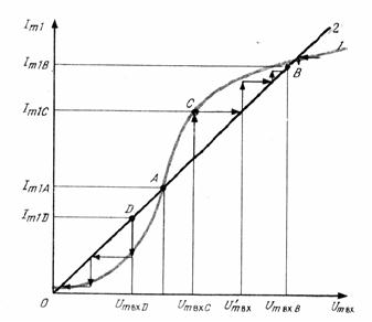 В условиях жесткого режима самовозбуждения (рисунок 10.4) колебательная характеристика 1 и линия обратной связи имеют три общих точки: О, А, В. Точка 0 характеризует устойчивое состояние покоя автогенератора, т. е. отсутствие самовозбуждения при малых начальных амплитудах колебаний. Колебания возникают только когда первоначальная амплитуда входного напряжения становится больше UmвхА, определяемого точкой А на рис. 10.4, например, напряжение увеличилось до значения UmвхС. Вызванный этим напряжением ток Im1C увеличит c помощью обратной связи напряжение на входе генератора, что приведет к большему возрастанию тока и т. д.