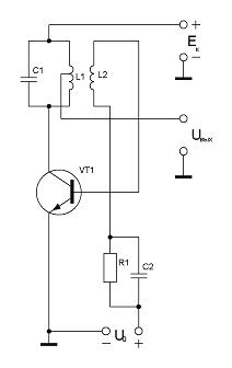 Его применение обеспечивает возможность работы автогенератора при первоначальном включении в режиме мягкого самовозбуждения с последующим автоматическим переходом в режим жесткого самовозбуждения. Этого достигают применением в автогенераторе специальной цепи автоматического смещения. На рис. 10.5, изображена упрощенная принципиальная схема автогенератора на биполярном транзисторе, нагрузкой которого служит колебательный контур L1C1. Напряжение положительной обратной связи создается на катушке L2 и подводится между базой и эмиттером транзистора. Начальное напряжение смещения на базе транзистора создается источником U0. Последовательно с этим источником включена цепь автосмещения R1С2.