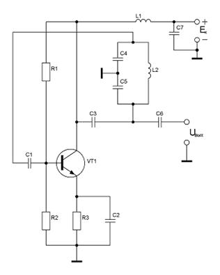 Одна из возможных схем такого генератора представлена на рисунке 11.5. В этой схеме применен колебательный контур третьего вида L2С4С5, соединенный точками к, э, б соответственно через конденсаторы СЗ, С2 и С1 с коллектором, эмиттером и базой транзистора VT1. В автогенераторе применена схема параллельного коллекторного питания, в которой источник питания, колебательный контур и транзистор включены параллельно друг другу. Для ослабления шунтирующего действия высокочастотного дросселя L1 на контур индуктивность дросселя выбирают исходя из соотношения L2 =(10...20) L1. Общую емкость контура составляют емкости двух конденсаторов: С4 и С5, причем С4 образует емкостную ветвь контура, а С5 и L1 — индуктивную ветвь. Так как соответствующие токи iС и iL в любой момент времени направлены противоположно друг другу, напряжения Uкэ и UБЭ противофазны. Следовательно, условие баланса фаз выполняется, поскольку напряжение