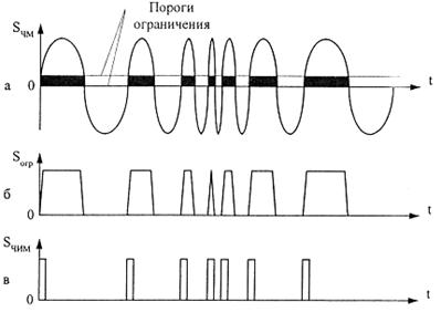 Косвенный метод получения ЧИМ основан на преобразовании ЧМ в ЧИМ (рисунок 18.1). Для этого ЧМ сигнал (а) пропускают через ограничитель по максимуму и минимуму с достаточно низкими порогами ограничения.