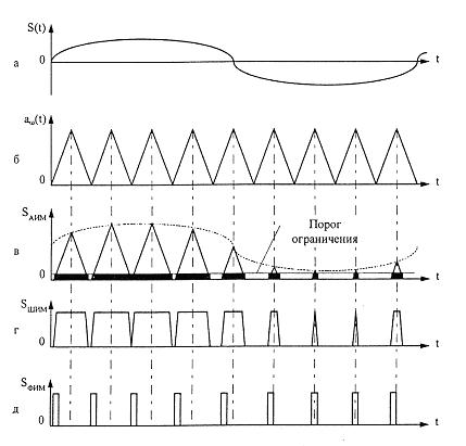 Рисунок 18.2 – Временные диаграммы, поясняющие преобразование АИМ сигнала в ШИМ и ФИМ: а) модулирующий сигнал; б) импульсная несущая; в) АИМ сигнал; г) ШИМ сигнал; д) ФИМ сигнал.