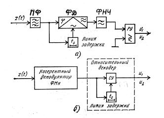Рисунок 27.6 – Структурные схемы приемника ОФМн сигналов: а – по методу сравнения фаз; б – по методу сравнения полярностей.
