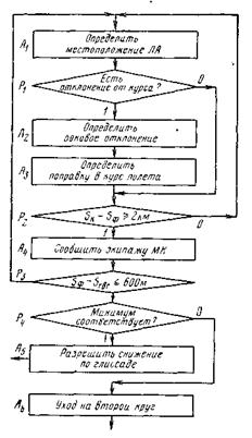 После выхода экипажа на связь диспетчер посадки опознает и определяет местоположение данного летательного аппарата относительно установленной схемы захода. Диспетчер проверяет отклонение отметки летательного аппарата (оператор Р\) относительно линии курса на экране радиолокатора. Если отклонения не наблюдается, то по стрелке с индексом 0 выполняется оператор Р2. При отклонении летательного аппарата от линии заданного пути управление по стрелке с индексом 1 передается элементу Л2. Диспетчер (оператор А2) определяет боковое отклонение летательного аппарата относительно линии курса, рассчитывает поправку в курс следования с учетом величины бокового уклонения, ее тенденции и удаления летательного аппарата от торца ВПП (оператор Л3).