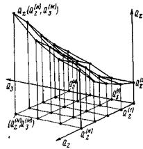 Простейшим примером такой векторной оценки загруженности диспетчера может служить двумерный случай, когда в качестве одной из компонент вектора загруженности берется уровень организации УВД в данной зоне Q2, а в качестве другой - нарастающая ситуационная сложность воздушной обстановки при непосредственном УВД Qз (наличие метеоявлений, усложняющих процесс УВД, особых случаев, конфликтных ситуаций и т. д.). Тогда количественные значения загруженности, отсчитываемые по третьей оси Qз могут быть представлены точками на некоторой геометрической поверхности с нарастающими по мере движения вдоль оси Q2 усложнениями организации управления воздушным движением (увеличения числа трасс, точек их пересечения либо схождения,, наличия зон отсутствия радиолокационного контроля и т. д.). Аналогично по мере движения вдоль оси Q3 нарастает ситуационная1 сложность ДВО (рис. 4.2). Для серьезного исследования загруженности следует учитывать и другие важнейшие компоненты, начиная от уровня профессиональной подготовки (Q1 и до психофизиологического состояния диспетчера Qn. В этом случае загруженность будет характеризоваться точками n-мерной поверхности, общие свойства которой будут, видимо, аналогичны приведенным на рис. 4.2.