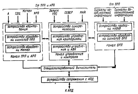 Объединение информации ПРЛ и ВРЛ осуществляется программным способом в специализированном вычислителе (СВ).При этом СВ производит отождествление координатной информации ПРЛ и ВРЛ, привязку дополнительной информации ВРЛк объединенной координатной, межобзорную обработку неотождествленных пакетов ДКС ПРЛ для выделения ДКС движущихся целей и подавления сигналов неподвижных целей. Специализированный вычислитель обеспечивает хранение информации в течение необходимо времени, формирование стандартных сообщений и передачу их в АПД. '
