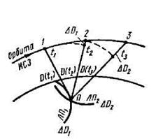 Таким образом, вычисление интеграла от доплеровской частоты в пределах t1 -t2 фиксирует разность дальностей DD1 до ИСЗ в последовательные моменты времени t1 и t2, т. е. дает значение навигационного параметра в разностно-дальномерной РНС с опорными станциями, координаты которых определяются положением ИСЗ в эти моменты времени. Фиксированное значение DD1 соответствует поверхности положения в виде гиперболоида. Производя интегрирование Fd(t) в течение интервала времени t2-t3 и пересчитав результат в разность расстояний получим вторую поверхность положения.