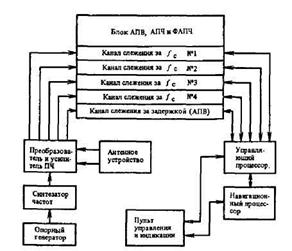 Приемное устройство выполняет функции супергетеродинного приемника, а также осуществляет первичную обработку сигналов. Гетеродинные частоты формируются из колебаний опорного генератора с помощью синтезатора частот. С УПЧ сигналы поступают на блоки поиска (по времени запаздывания и частоте) и измерения. После завершения поиска в блоке измерения происходит захват сигналов системами автоматической подстройка частоты (АПЧ), фазы (ФАПЧ) и времени (АПВ). По завершении переходных процессов в следящих системах