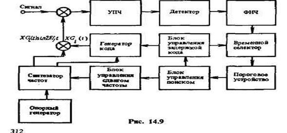 Упрощенная структурная схема устройства поиска представлена на рис. 10.9. На выходе генератора кода по команде блока управления поиском