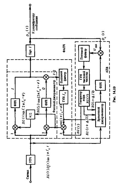 При анализе правила формирования сигнала ошибки предполагалось, что сигнал и опорное напряжение имеют вид гармонических колебаний. На самом же деле и сигнал и опорные колебания манипулированы по фазе кодом ХG(t). Для приведения в соответствие опорного колебания, вырабатываемого ГУН несущей, с ФМ-сигналом в схеме рис. 10.12 используется умножитель 3, осуществляющий фазовую манипуляцию опорного колебания. Модулирующая функция ХG(t) должна совпадать по времени запаздывания с кодом входного сигнала ХG(t)sin2pfсt. Обеспечение такого синхронизма по коду осуществляется системой АПВ. Система АПВ в данном случае должна быть некогерентной, так как система АПЧ не обеспечивает в отличие от ФАПЧ получения когерентного опорного колебания.