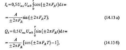 Квадратурные составляющие Iк-1 и Qk-1 запаздывают относительно Iк и Qt на время Т. Не останавливаясь на вопросах технической реализации правила (14.11), рассмотрим его физический смысл. Прежде всего докажем, что сигнал ошибки (14.11) пропорционален сдвигу частот Fd. Не нарушая общности рассуждений, сигнал и квадратурные опорные напряжения на входе умножителей 1 и 2 схемы рис. 14.12 можно принять гармоническими: Umc sin2pfct, Um0sin2p(fc±Fd)t, Um0cos2p(fct±Fd)t. Тогда на выходе умножителей