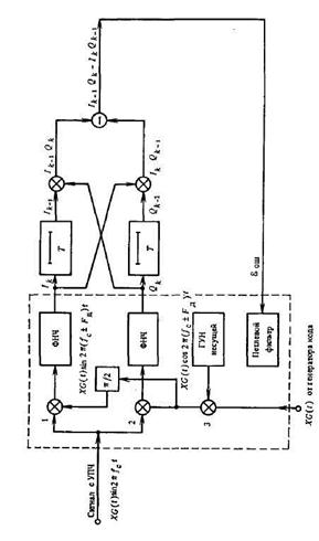 Упрощенная структурная схема системы АПЧ приведена на рис. 14.12. Обведенные пунктирной линией блоки выполняют те же функции, что и одноименные блоки в схеме рис. 14.10. Квадратурные составляющие Iк и Qk образуются так же, как и в схеме рис. 14.10 (индекс к указывает на принадлежность Ik и Qk к интервалу времени с порядковым номером к). Отличие состоит лишь в том, что в установившемся режиме в системе ФАПЧ сигнал и опорные образцы отличаются фазой несущих колебаний, в то время как в системе АПЧ - еще и по частоте (наличие доплеровского сдвига частоты Fd в квадратурных опорных колебаниях). Сигнал ошибки в системе АПЧ образуется по правилу