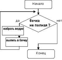 Вы приехали на дачу. Родители не отпустят Вас на реку, пока Выне наберёте полную бочкуводы из выкопанного рядом с ней колодца. Составьте и изобразите схему алгоритма наполнения бочки при помощи одного ведра. Изобразим этот циклический алгоритм языком блок-схем: