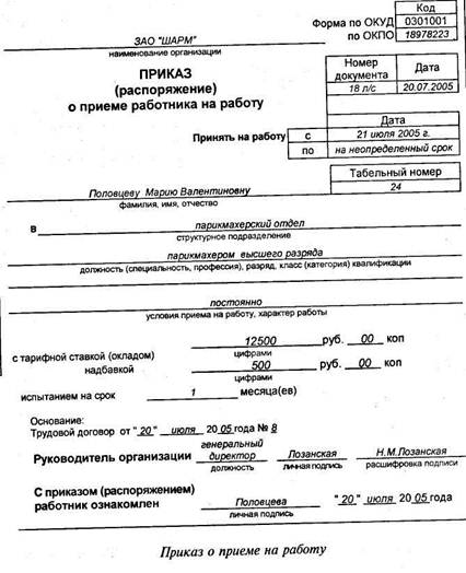 фамилия, имя, отчество работника (полностью); наименование структурного подразделения; профессия (должность); условия приема на работу (характер работы). Графа "основание" приказа о приеме содержит дату и номер трудового договора.