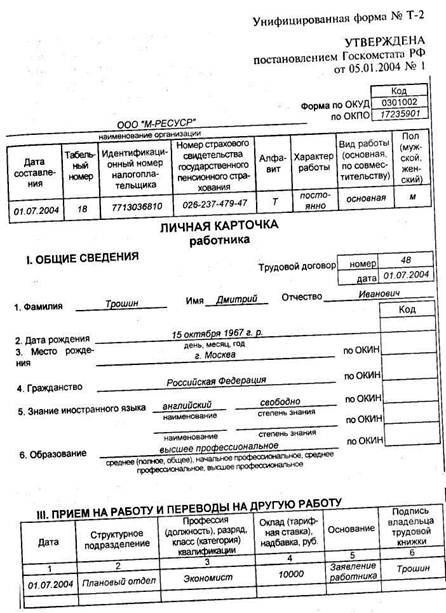 документа об окончании учебного заведения; страхового свидетельства пенсионного страхования; свидетельства о постановке на учет в налоговом органе; других документов, предусмотренных законодательством; сведений, сообщаемых о себе работником. Личная карточка оформляются на бланке унифицированной формы № Т-2.
