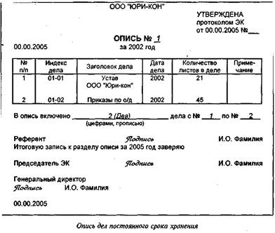На документы, выделенные к уничтожению, составляется акт. В акт на уничтожение в любой последовательности вносятся заголовки отдельных дел или групповые заголовки дел с указанием количества дел, включенных в группу, например: "Переписка за 2000 - 2002 гг. - 3 дела".Акты и описи составляются и подписываются членами ЭК, рассматриваются и утверждаются руководителем предприятия. 3. Прием-передача дел в архив производится работниками службы делопроизводства и архивистом. При этом на всех экземплярах описи против каждого дела ставится отметка о его наличии. В конце каждого экземпляра описи указываются: цифрами и прописью количество фактически принятых в архив дел, номера отсутствующих дел, дата приема-передачи, а также подписи участников приема-передачи дел.