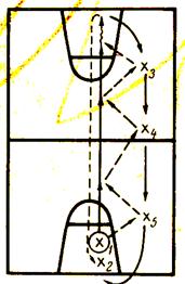 Х1 передает мяч Х5 и бежит по прямой. Х5 получает мяч и отдает его двигающемуся вперед Х1, который, получив мяч в движении, делает два шага и отдает мяч Х4, и т. д. Х1, получив мяч от Х3 бросает его в корзину, затем подбирает мяч, передает Х2 и встает на место Х3. Пока мяч летит от Х1 к Х2, вся шеренга сдвигается на одно место: Х3— на место Х4, Х4— на место Х5, Х5 — на место Х2. Чтобы усложнить упражнение, можно ввести два-три мяча.
