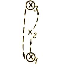 Упражнение выполняется тройками игроков с двумя мячами (рис.7). Мячи у Х1 и Х3. Х1 передает мяч Х2 и получает мяч от Х3. Х2 передает мяч Х3. Передачи следует выполнять указанным тренером способом.