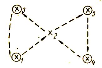 Группа разбивается на пятерки, как показано на рис.8. Упражнение выполняется с четырьмя мячами. Мячи у всех, кроме игрока, стоящего в середине. Х4 и Х1 поочередно передают мячи Х2. Получив мяч от Х4, Х2 отдает его Х3; получив мяч от Х1 он отдает его Х5 Х3 и Х5 отдают свои мячи игрокам, стоящим напротив, когда те отдают мячи в центр.