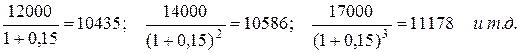 1 По бездисконтному методу срока окупаемости инвестиций. Если не принимать во внимание желательную 15-процентную рентабельность инвестиций, то нетрудно заметить, что окупаемость будет достигнута где-то между третьим и четвертым годами. Еще точнее, за три года будет возмещено 43 000 долл. затрат, а на покрытие остающихся 7 000 долл. потребуется (7 000: 20 000) = = 0,35 года, т. е. период окупаемости равен 3,35 года.