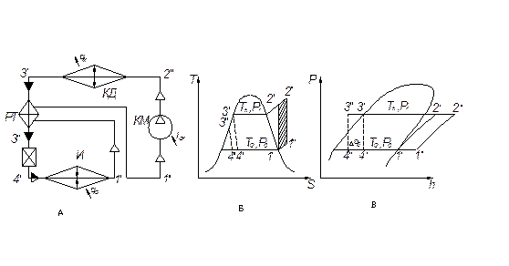После испарителя насыщенный пар холодильного агента состояния т.1′ направляется в регенеративный теплообменник, где перегревается в процессе 1′ - 1″ за счет теплообмена с теплым жидким холодильным агентом, идущим из конденсатора. Перегретый пар всасывается компрессором, в котором адиабатически сжимается в процессе 1″ - 2″ от давления кипения Ро до давления конденсации Рк. При этом его температура повышается. Сжатый горячий пар подается в конденсатор. где сначала охлаждается до температуры насыщения, а затем конденсируется в общем процессе 2″ - 3′. Образовавшаяся в процессе конденсации жидкость поступает в ренегеративный теплообменник, в котором охлаждается в процессе 3′ - 3″ за счет теплообмена с холодным паром, выходящим из испарителя. Охлажденный жидкий хладагент дросселируется в процессе 3″ - 4″ от давления конденсации Рк до давления кипения Ро. После дросселирования холодильный агент поступает в испаритель, где жидкость кипит в процессе 4″ - 1′, отводя теплоту от охлаждаемой среды. Пар, образовавшийся при кипении, перегревается в регенеративном теплообменнике, всасывается компрессором и цикл повторяется вновь.