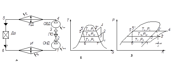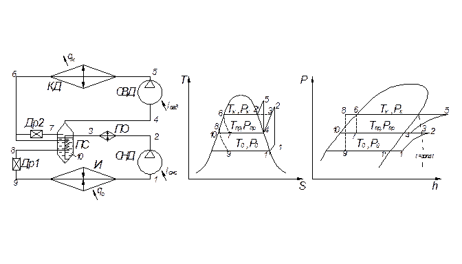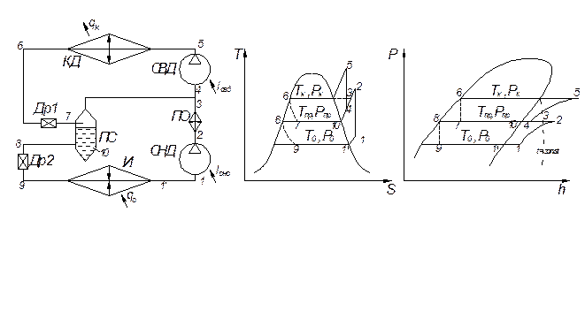 Двухступенчатая холодильная машина, функциональная схема которой представлена на рисунке 5.5. включает в себя компрессор низкого давления, компрессор высокого давления, промежуточный охладитель, конденсатор, испаритель и дроссельное устройство. Термодинамический цикл в S-T и h-Р диаграммах показан на том же рисунке.