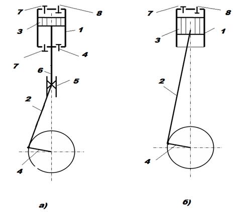 В крейцкопфных конструкциях компрессоров (рисунок 3а) движение от шатуна к поршню передается через специальный механизм-крейцкопф и шток. В бескрейцкопфных компрессорах движение от шатуна непосредственно передается поршню (рисунок 3б). В крейцкопфных компрессорах поршень имеет небольшую высоту, достаточную только для размещения колец, так как всю боковую нагрузку воспринимает на себя крейцкопф. В бескрейцкопфных компрессорах высота поршня значительно больше, здесь роль крейцкопфа выполняет нижняя часть поршня. В настоящее время в холодильной технике применяются в основном бескрейцкопфные компрессоры, как наиболее простые.