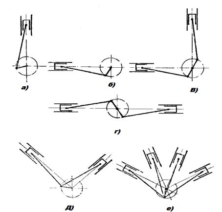 а – вертикальный; б – горизонтальный; в – угловой; г – оппозитный, д – V-образный; е – W-образный.