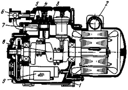1 — блок картер, 2 — всасывающий патрубок, 3 — блок цилиндров, 4 — крышка цилиндров, 5 — клапанная группа, 6 — нагнетательный патрубок, 7 — шатунно-поршневая группа, 8—коленчатый вал, 9 – фильтр