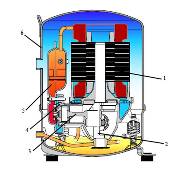 1 – электродвигатель, 2 – коленчатый вал, 3 – шатунно-поршневая группа, 4 – блок цилиндров, 5 – глушитель шума, 6 – кожух.