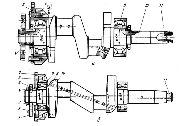 1-шестерня промежуточная; 2-валик промежуточной шестерни; 3-гайка; 4-шестерня привода маслонасоса; 5-упорное кольцо; 6-крышка корпуса; 7-корпус подшипника; 8-подшипник качения; 9-заглушка; 10-коленчатый вал; 11-пробка.