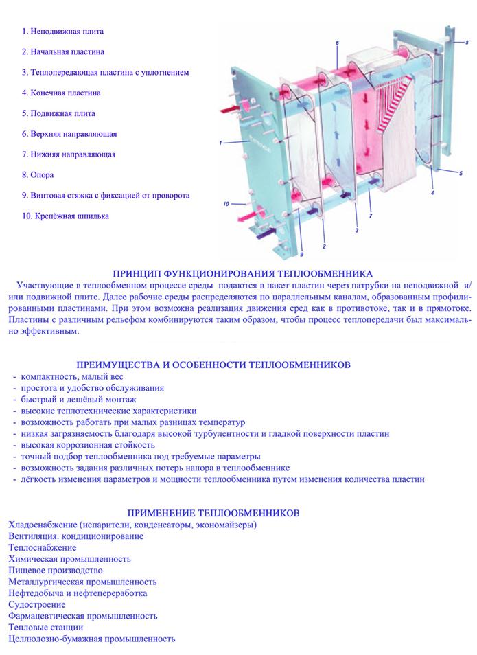 Пластинчатые конденсаторы состоят из набора гофрированных пластин. Каждая пластина с одной стороны омывается холодильным агентом, а с другой стороны – водой. Между пластинами устанавливаются уплотнительные прокладки. Направление гофр соседних пластин должно быть противоположно для турбулизации потока. С помощью неподвижных и подвижных плит пластины стягиваются шпильками. По конструкции они бывают разборные, полуразборные и неразборные. В разборных конденсаторах между всеми пластинами устанавливаются резиновые или паранитовые прокладки. Преимущества такой конструкции – возможность разборки и очистки всех пластин. В полуразборных конденсаторах пластины попарно сварены между собой со стороны холодильного агента. В неразборных конденсаторах все пластины сварены между собой.