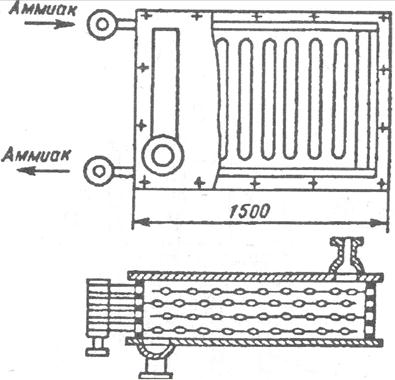 Пакетно–панельный конденсатор представляет собой большой стальной прямоугольный бак. Внутри бака размещено несколько теплообменных секций. Каждая секция представляет собой цельноштампованную панель с вертикальными каналами. Сверху панель приварена к верхнему паровому коллектору, а снизу – к жидкостному коллектору. Верхние коллекторы всех теплообменных секций соединены с общим паровым коллектором. Нижние коллекторы всех теплообменных секций соединены с общим жидкостным коллектором. В баке все теплообменные секции установлены в шахматном порядке.